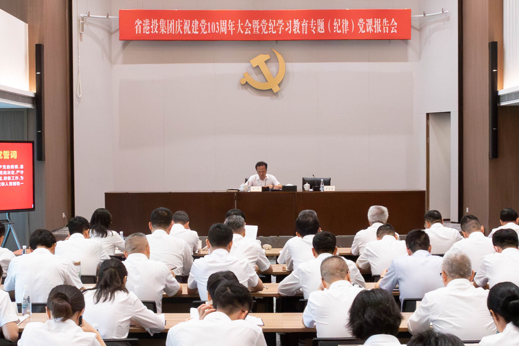 7月1日,省港投集团召开庆祝建党103周年大会暨党纪学习教育专题(纪律)党课报告会。会上,新党员代表进行了入党宣誓、参会党员重温了入党誓词,集团领导向新党员代表赠送了《中国共产党章程》《中国共产党纪律处分条例》。集团党委书记、董事长杨军作专题(纪律)党课报告并宣讲省委十二届五次全会精神,集团党委副书记、副董事长、总经理曾崇勇主持会议。