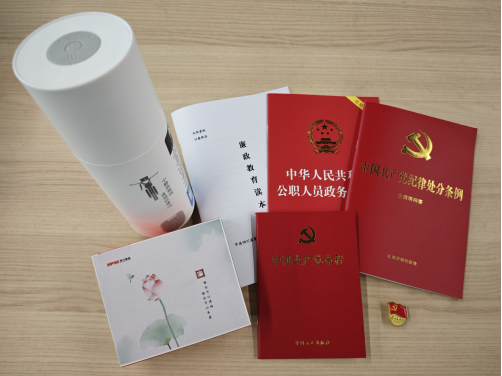 “大礼包”内容丰富多样,既有《中国共产党章程》《中国共产党纪律处分条例》等规章资料,也有集团纪委整理印制的《廉政教育读本》、佩戴的党徽,还有具有港投特色、富含教育意义的廉洁文化纪念品,如刻有“廉·宁静而致远 淡泊以清心”字样的保温杯、充电宝等,每一件都蕴含着深刻的廉洁寓意,时刻提醒大家要肩上扛廉、心中有廉、时时守廉,让廉洁文化“原创”产品变成正风反腐的“提示卡”和“警卫员”,让“小物件”充分发挥“大作用”,让廉洁文化宣传“潜移默化、润物无声”。