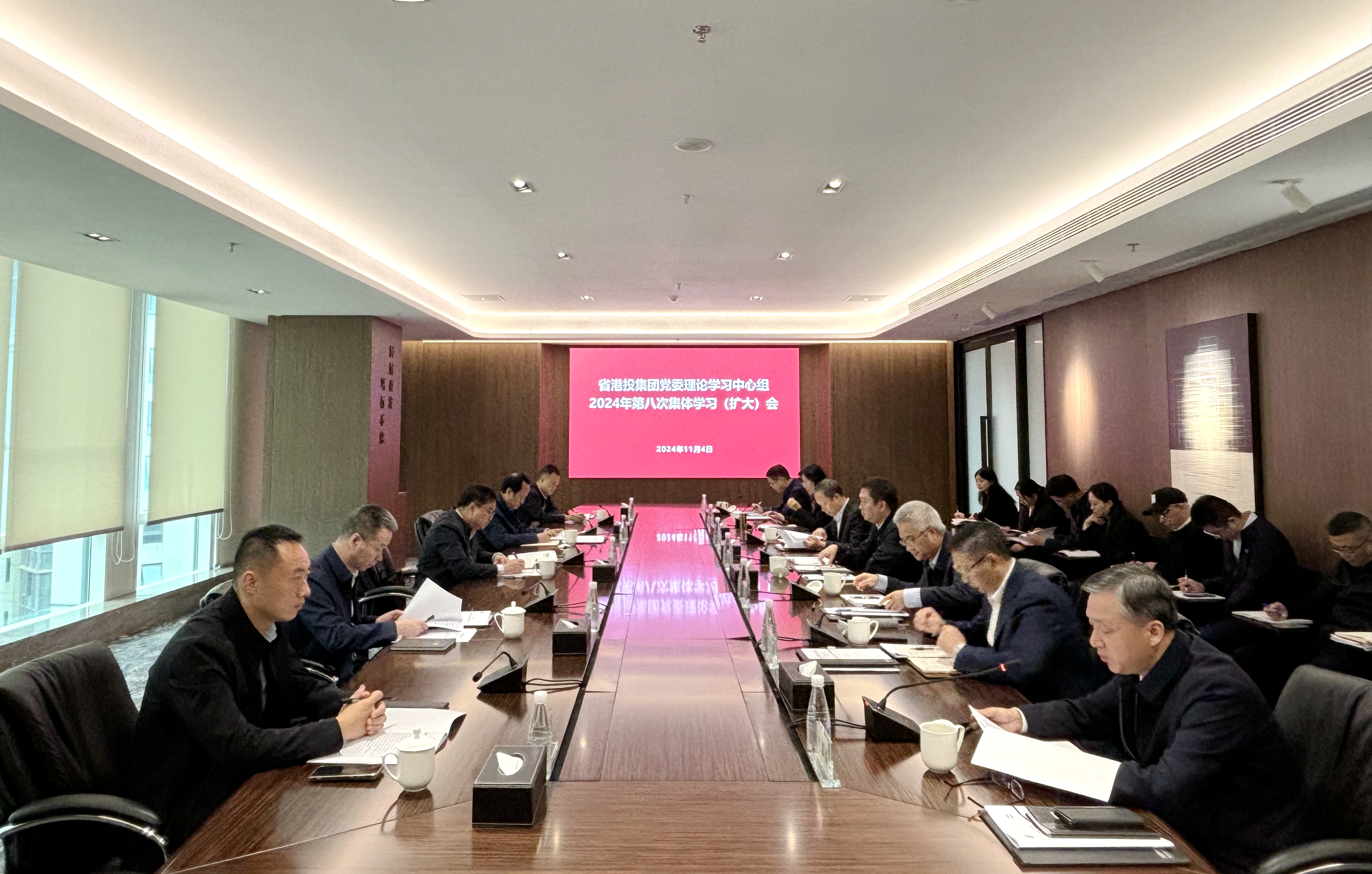 11月4日,省港投集团召开党委理论学习中心组2024年第八次集体学习(扩大)会议,省国资委党委委员、副主任、机关党委书记王先权同志到会列席旁听指导,省港投集团党委书记、董事长杨军主持会议并讲话。
