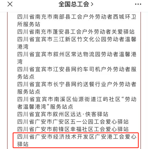 近日,全国总工会发布2023年“最美工会户外劳动服务站点”名单,广安港工会爱心驿站上榜。