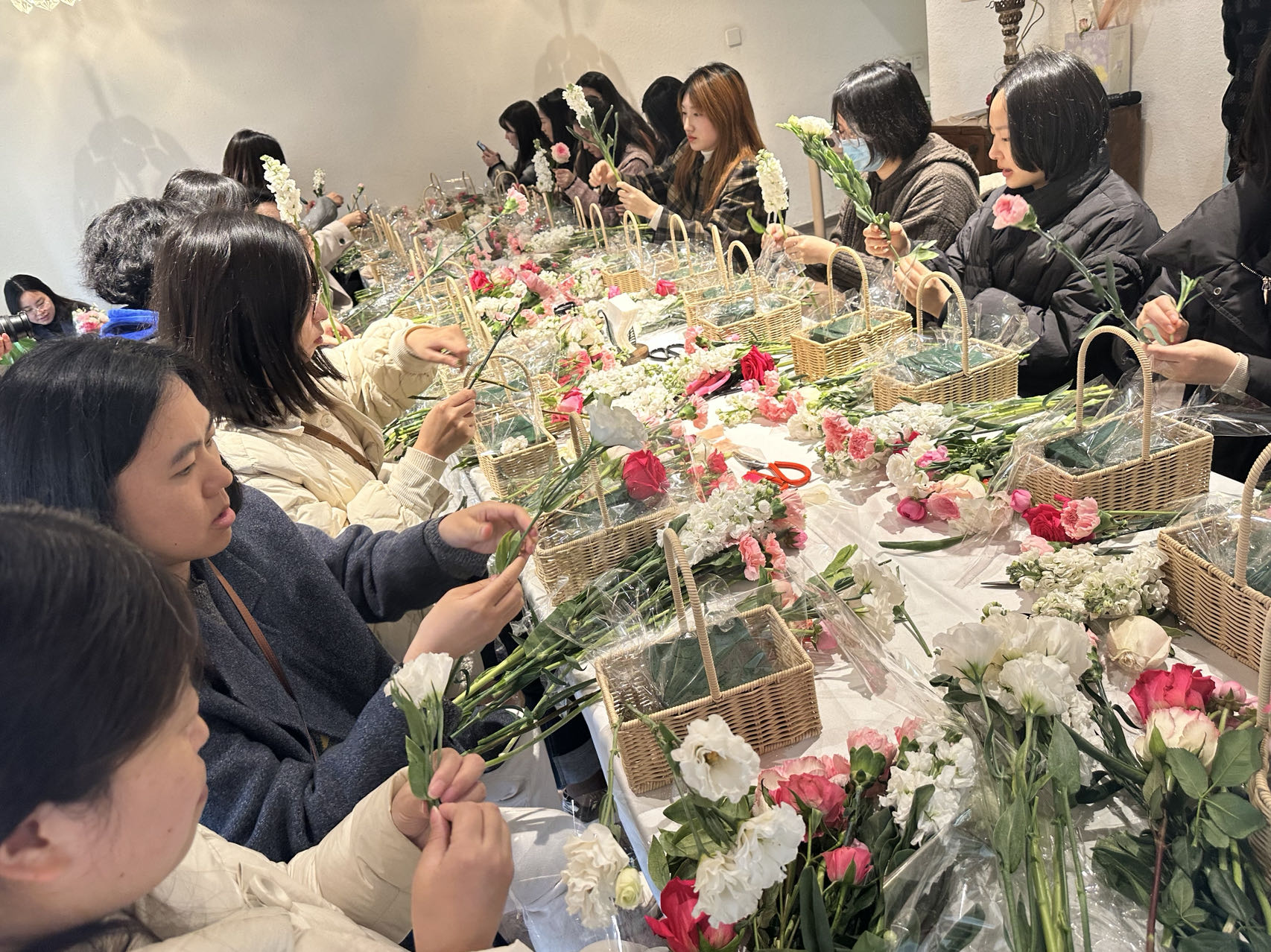 观展后,女职工们分组进行了创意花艺比赛。在专业老师的指导下,大家了解了花材名称、插花步骤、插花技巧等,现场气氛拼劲十足,女职工们充分展示自己的艺术审美和聪明才智,完成了600余朵花卉创作,花艺作品层次丰富、生机勃勃。