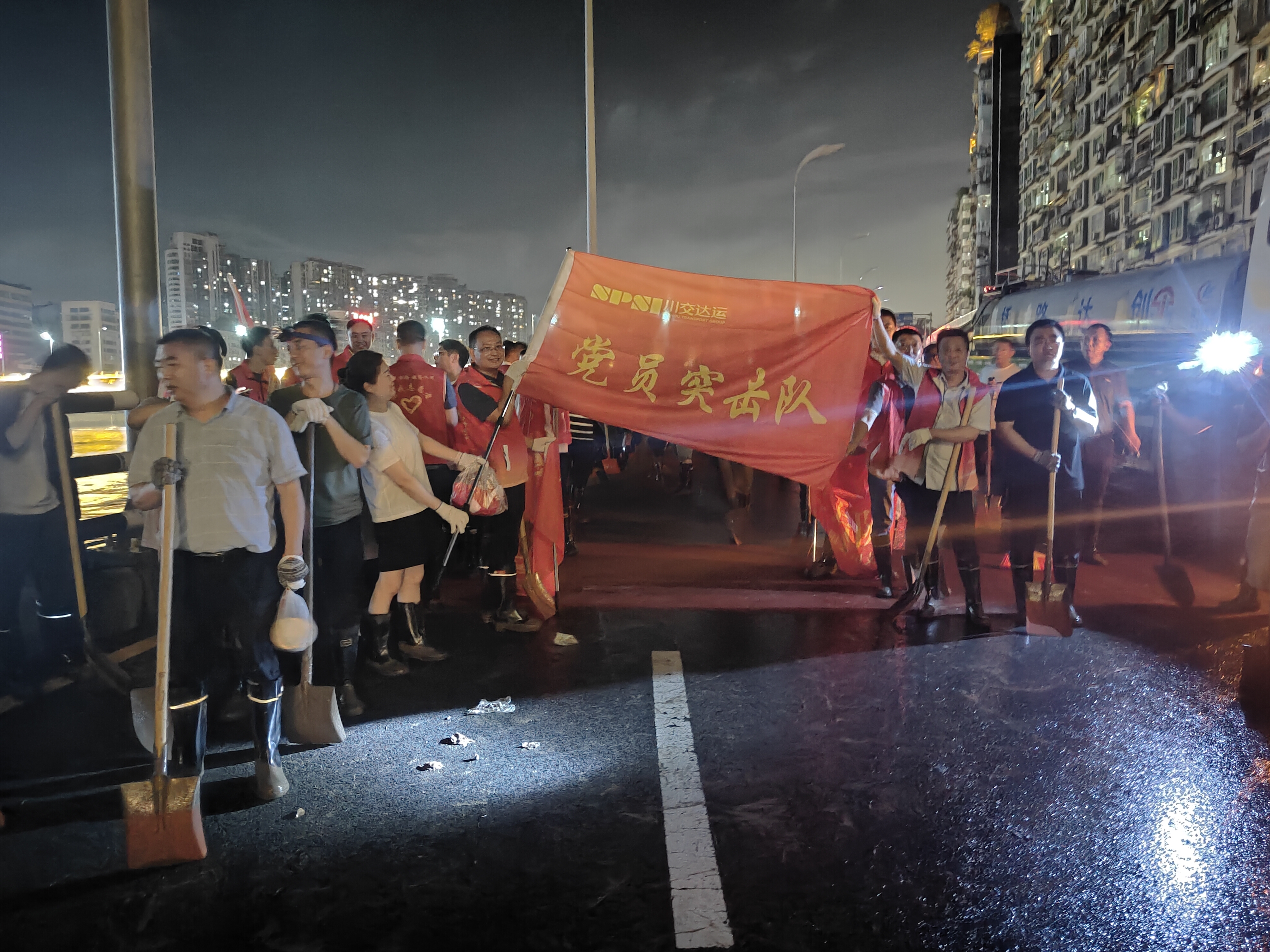 7月11日晚8时许,来自川交达运8个支部的30余名党员组成党员突击队,携带铁锹、扫把等工具来到清淤现场,有序地铲除杂物、检查窨井、倾倒淤泥、冲刷路面。经过6个多小时的奋战,达城滨河路又恢复了干净整洁的模样,此时已是7月12日凌晨3点,参与清淤的党员突击队成员方才拖着疲惫的身躯回家。