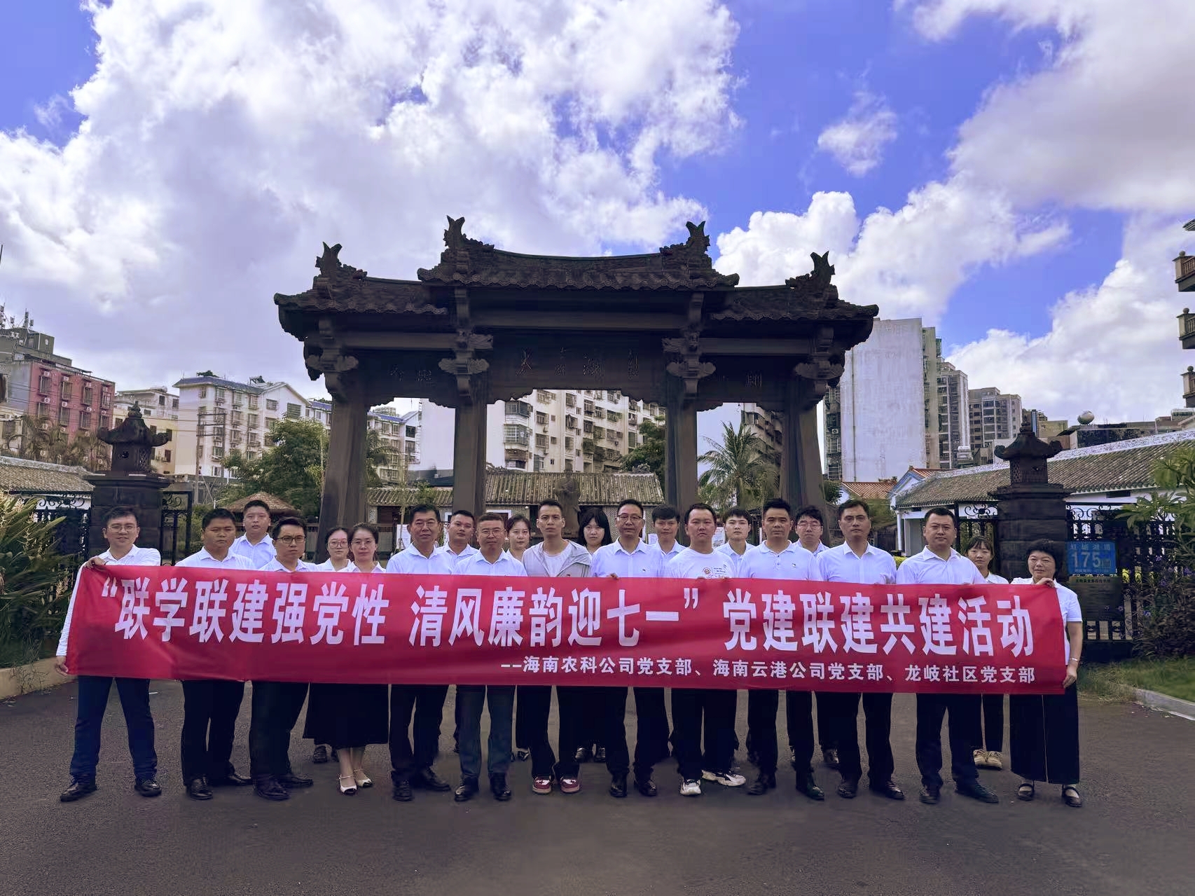 为加强党组织之间的交流合作、弘扬廉洁文化,在中国共产党成立104周年之际,海南农科公司党支部联合海南云港公司党支部、龙岐社区党支部开展“联学联建强党性,清风廉韵迎七一”主题党日活动。海南农科公司全体员工、海南云港公司驻琼办公员工以及海口美兰区龙岐大社区党群服务中心(海南省首批基层治理创新试验区)党员代表共20余人参与活动。