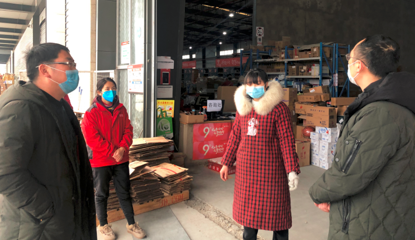 与其他部门同事同京东仓库现场负责人讨论防疫工作