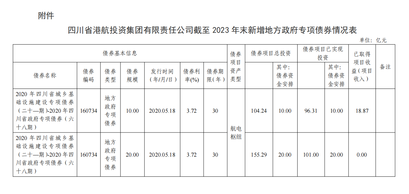 2020年四川省政府专项债券第六十八期于2020年5月18日发行成功,债券代码160734,债券简称20四川78,债券利率3.72%,期限30年。其中包含岷江航电项目30亿元,分别为犍为航电枢纽10亿元、龙溪口航电枢纽20亿元。按照《四川省财政厅关于做好2024年地方政府债券存续期信息公开工作的通知》(川财债函〔2024〕19号)要求,现将岷江犍为、龙溪口航电枢纽项目截至2023年底相关专项债券资金使用、项目建设进度、资产形成等情况公示如下: