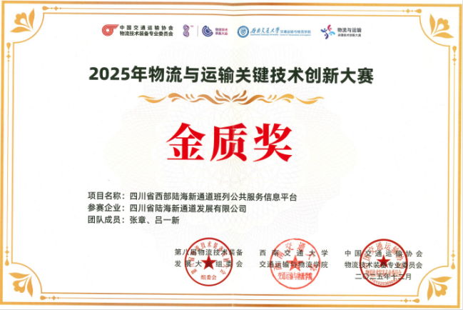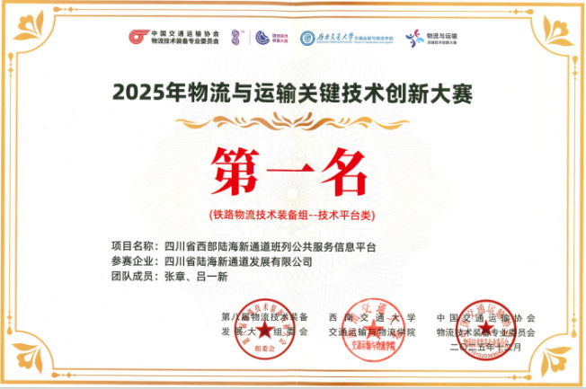在近日落幕的第八届物流技术装备发展大会暨“2025年物流与运输关键技术创新大赛”中,陆新公司自主研发的“四川省西部陆海新通道班列公共服务信息平台”脱颖而出,一举夺得大赛“铁路组技术平台类第一名”及“创新大赛金质奖”两项最高荣誉。