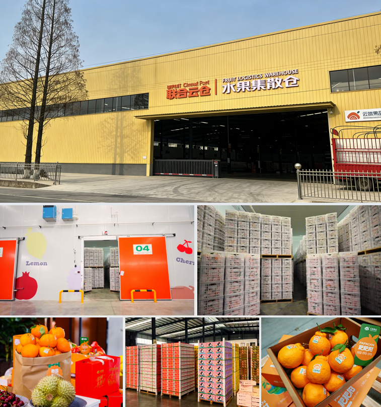“联合云仓—水果集散仓(蒲江)”建筑面积1.2万平方米,集专业冷库与收货、存储、分拣、集货、发货、直播等功能于一体,符合出口基地认证标准。“云新果品”是陆海云港所属云新公司的自有水果品牌,依托集散仓为核心供应链载体,以整合产地资源、强化品控标准、畅通流通渠道为抓手,着力打造标准化、高品质的川果品牌。