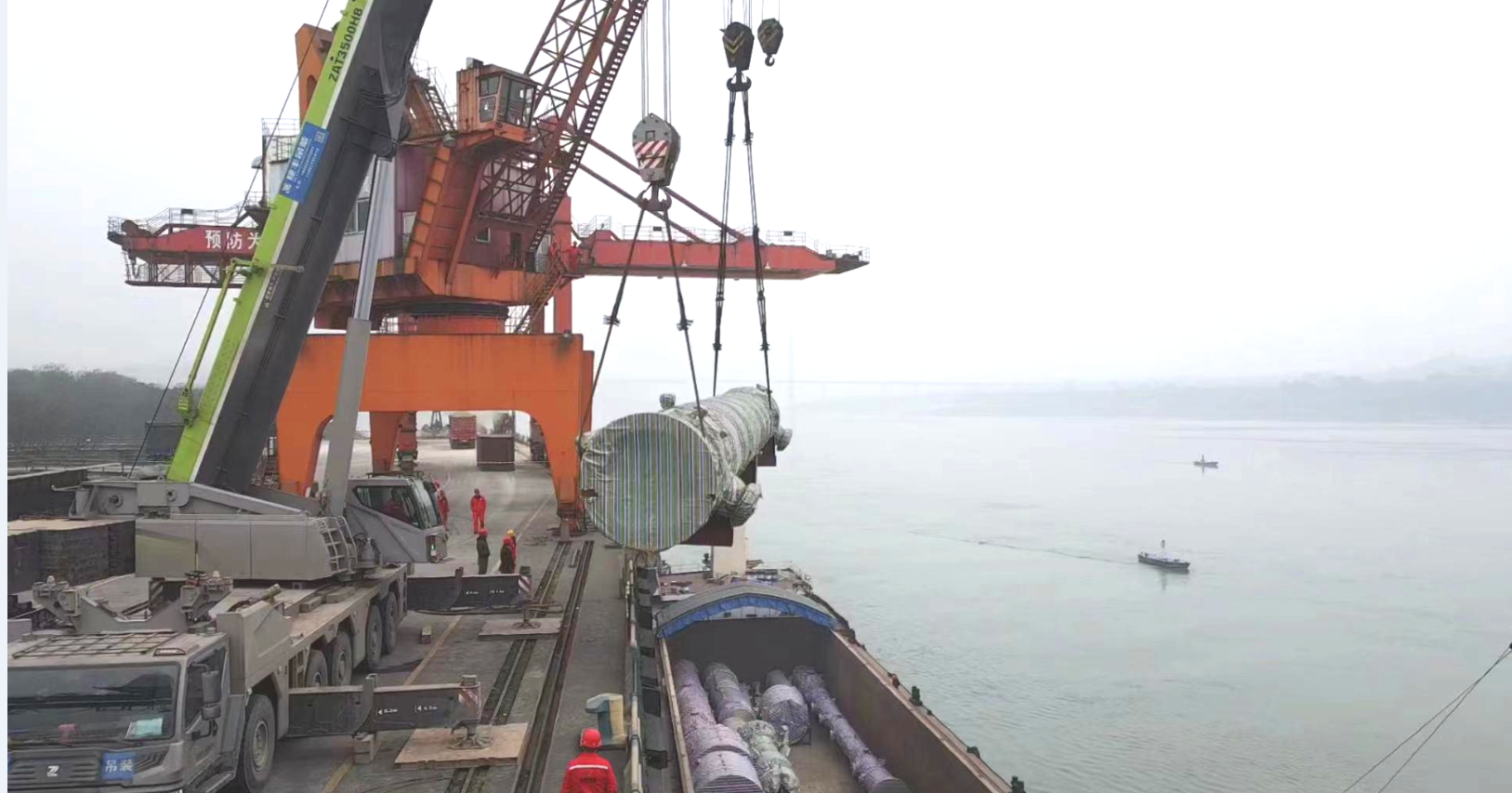 该设备的成功吊装,是泸州港岸吊与汽车吊配合进行的第一次吊装作业,也是泸州港自开港以来岸吊参与起吊吨位最大的一次吊装作业,标志着泸州港大件设备吊装能力往前迈出了坚实一步。