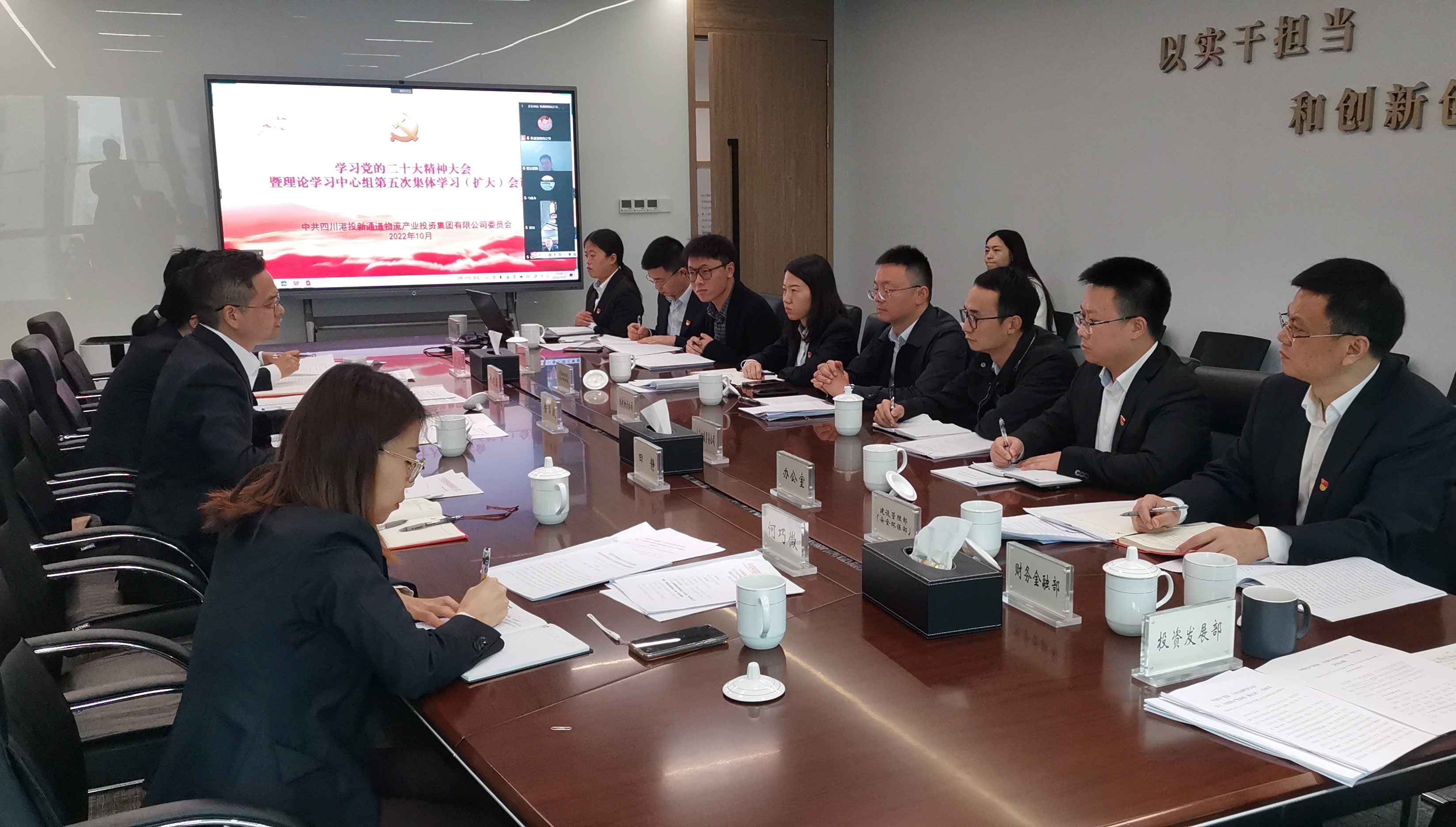 会议要求,一是深入学习领会,持续推动会议精神学习走深走实。各级领导干部要发挥领学促学作用,先学一步、学深一层,当好深入学习贯彻党的二十大精神的带头人;各级党组织要制定学习计划,通过党委理论学习中心组、“三会一课”、专题培训、交流研讨等形式,提升学习行动自觉;要及时转发深入解读大会提出的重大理论观点、重大方针政策、重大工作部署的理论文章,营造良好学习氛围。二是抓好贯彻落实,持续推动企业改革发展成势见效。要以更大力度加快产业布局,在已有项目基础上,加快推进通道建设,尽快形成物流网络体系。要以更快节奏抓项目扩投资,加快推进广元川陕甘铁路物流集散中心项目、乐至成渝双城配送中心、整合组建物流研究院等重点工作,认真盘点工作进展和措施落实情况,紧盯欠账指标和滞后工作,找准关键症结,精准施策发力,全力以赴冲刺四季度、决胜全年度;要以更强担当防风险守底线,抓细抓实贸易风险防控、疫情防控、安全环保等各项工作,确保公司发展行稳致远。三是坚持敢于斗争,大力弘扬自我革命精神。公司党员、年轻干部要充分发扬担当、实干精神,提升工作本领,鼓足信心勇气,坚决打赢“决战四季度、大干一百天”攻坚战;要深入推进全面从严治党工作落地落实,持续深化作风建设,不断巩固良好政治生态。