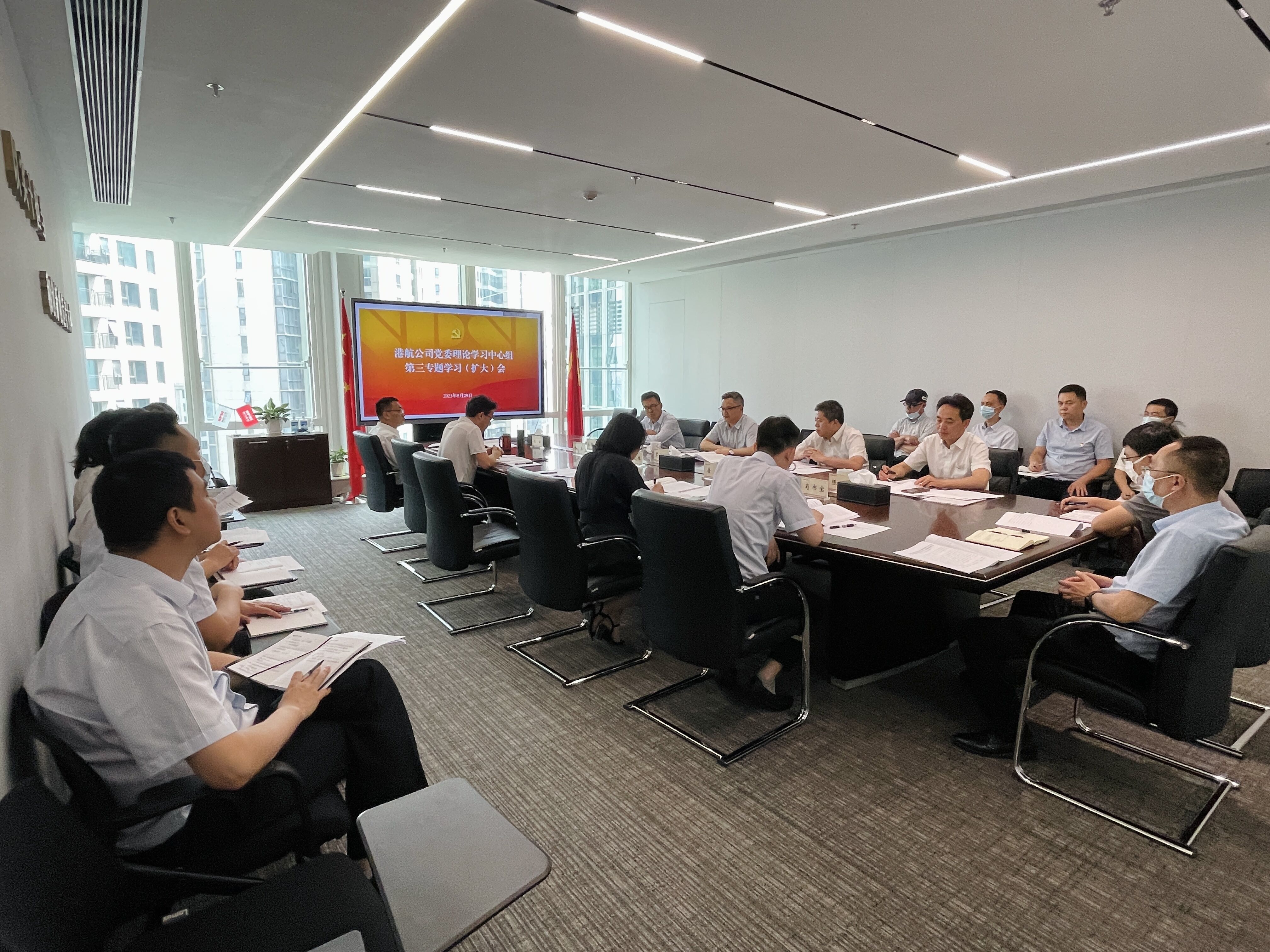 5月29日,港航公司党委召开中心组2023年第三专题学习(扩大)会,公司党委书记、董事长罗宗全主持会议并讲话,公司领导班子成员、各部门主要负责人参加会议。