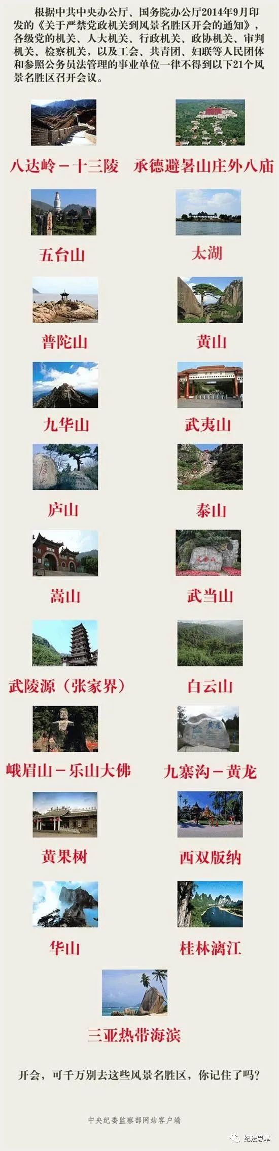 “禁止召开会议的风景名胜区”,主要是指中央在厉行节约反对浪费方面出台的严禁党政机关到风景名胜区开会制度中,明令禁止作为开会地点的21个风景名胜区。