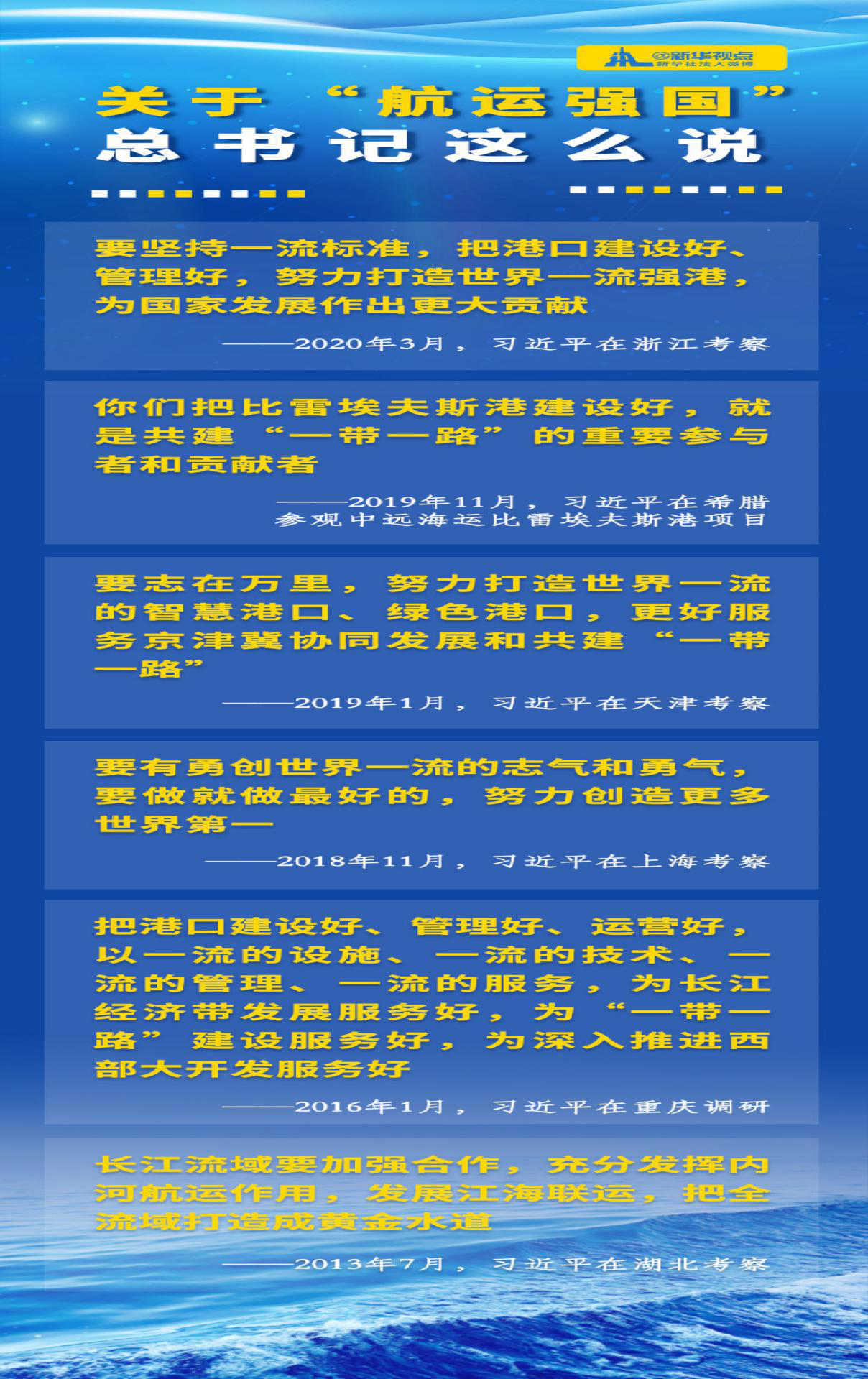 党的十八大以来,习近平总书记在更广阔的视野上对港口进行谋篇布局,规划航运强国建设。他经常利用国内考察或是出访的机会,到港口进行调研,指导工作: