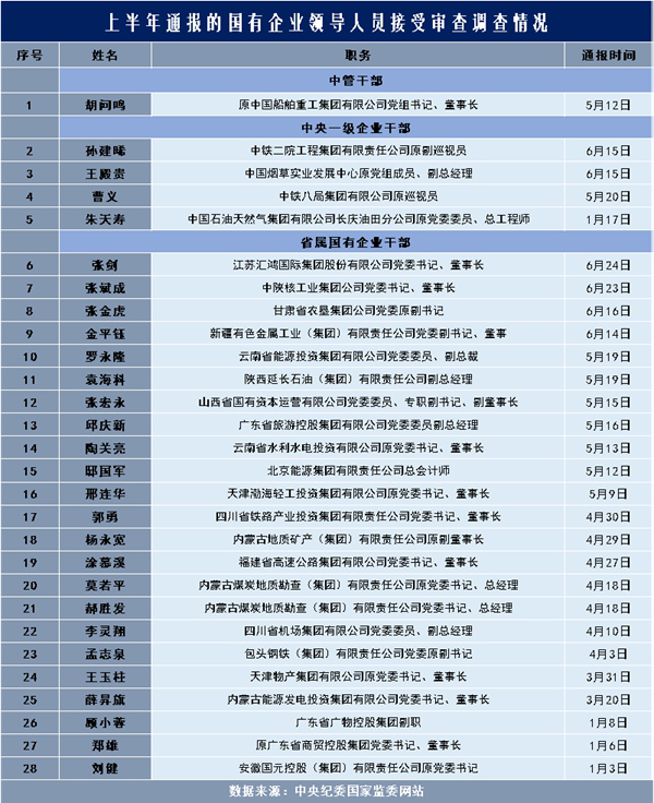 上半年通报的国有企业领导人员接受审查调查情况 李灵娜制图